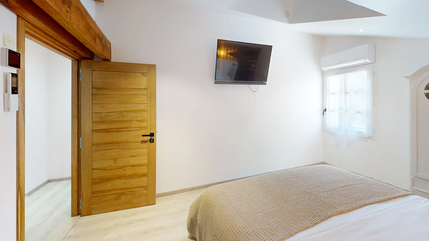 Au calme du deuxième étage, La Chambre Polita offre une vue apaisante sur la piscine et les vignes.